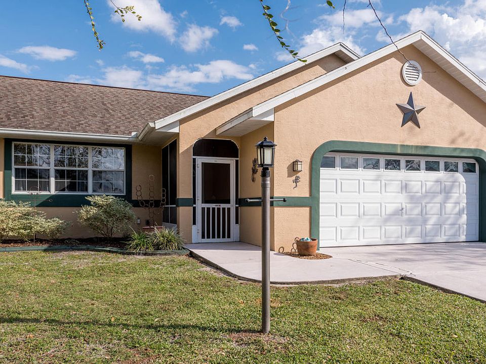 Beautiful home on double lot! New AC in 2009, New Roof in 2010 extra insulation added to increase efficiency. New black stainless steel GE appliances in 2015, new fixtures, fresh paint etc! Screened in front porch leads to the foyer. Inside you will notice how spacious & bright the large living room is with natural light beaming through the windows as well as the attention to detail with crown molding. The split plan home has large rooms & bathrooms. The covered lanai is vented for heat/cool & leads to a patio perfect for entertaining with cookouts or even a hot tub as its already wired with a 220 line. Garage has lots of storage. The 3rd garage has 1/2 bath & is heated/cooled its currently used as a gym but could be and office has separate entry. A great home in a developing area!