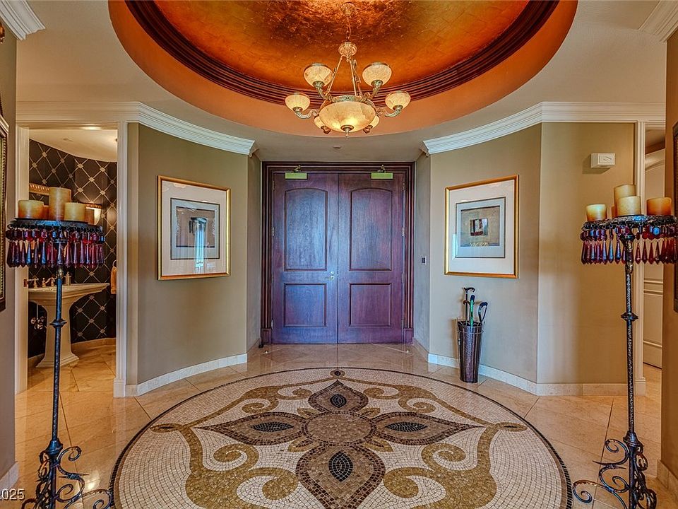 Elegant 3 bedroom 3.5 bath, Park Towers 4th floor unit w/ Sphere & Strip views. Grand Foyer w/Inlaid Mosaic marble floors, Great room features floor to ceiling windows w/remote shades Crestron system, access to terrace. Island kitchen absolute granite,GE Monogram appliances. Gas 6 burner cooktop w/griddle. Sub Zero wine fridge, 2 ovens. Access to terrace. Primary bedroom features a terrace w/Sphere view, fan, LG organized w-in closet, jetted tub, sep shower, bidet, all marble baths. 2nd & 3rd bedroom have fans & own baths. LG laundry room w/sink. Guest bath, neutral decor. Will sell furnished some exclusions. amenities include theatre rm/card rm/wine cellar/billard rm/fitness and spa center/ pool/spa/cabanas, BBQ area, tennis, business center