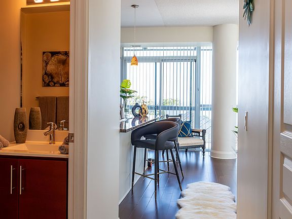 Breathtaking lake viewsModern eleganceLarge balconyGourmet kitchenRich chocolate cabinetryStainless steel appliancesLarge quartz peninsula