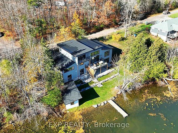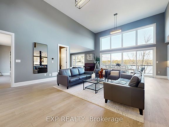 Stunning custom-built lakefront home with 175 ft of private shoreline surrounded by mature trees. The master bedroom loft with a walkout to a balcony with breathtaking lake views and a luxurious ensuite. The main floor with 10 to 16 ft ceilings, a spacious open-concept layout, large windows for natural light, and a walkout to a terrace overlooking the lake. The elegant foyer features built-in closets on both sides, modern kitchen includes a cozy built-in breakfast area and unique architectural design. The walk-out basement offers 9 ft ceilings, two bedrooms with ensuites, and access to a lake view terrace from both the bedrooms and the recreation room. A separate side entrance leads to a private "man cave" with a kitchenette and 3-piece bath - perfect for guests or hobbies. Enjoy a lakeside sauna with a sitting and relaxation area, a garage with large windows, and a mudroom with built-in closets and a convenient dog spa for post-walk cleanups. Heated bathroom floors. House is built using the ICF construction method for superior efficiency and durability, this home also includes a central backup generator and a heat pump system.
