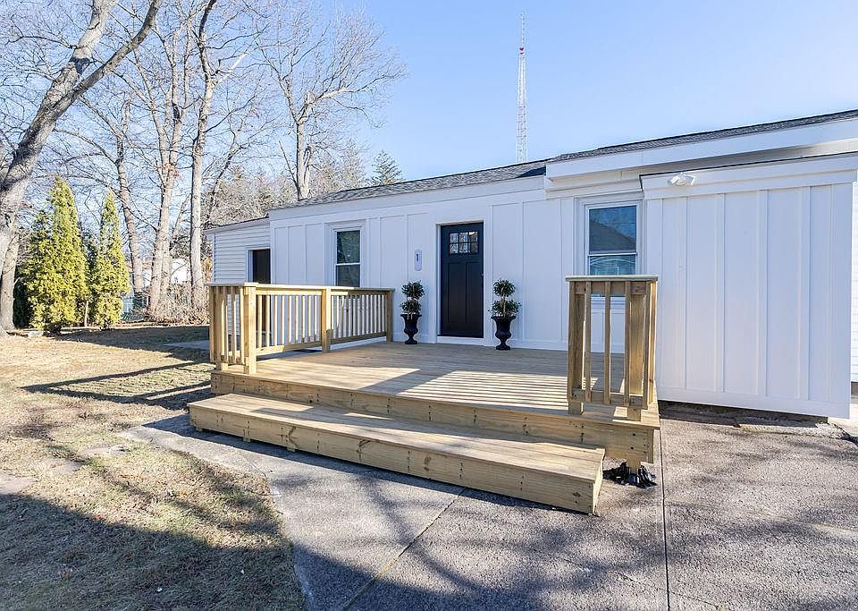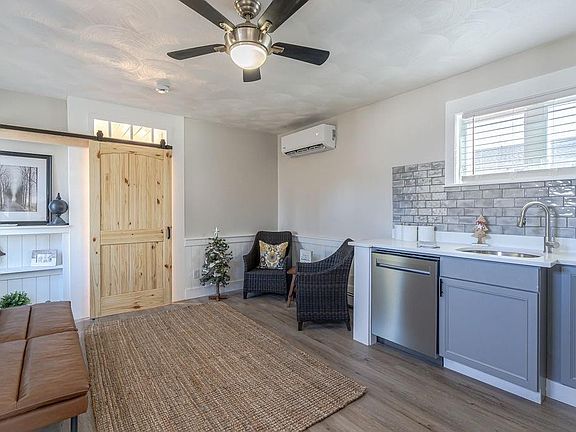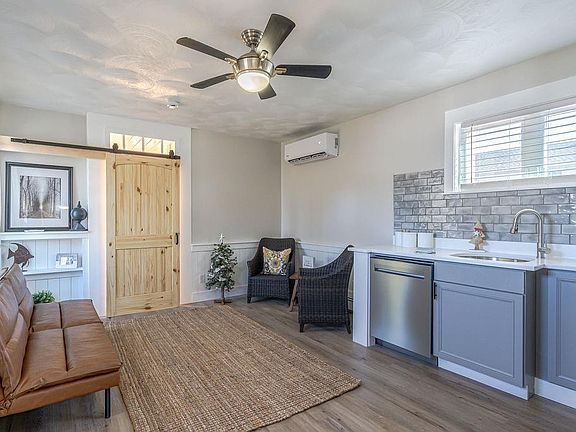 Step into this recently renovated gem, where modern elegance meets cozy charm. This light-filled, open-concept Condo alternative One/Two bed home features stunning shiplap accents throughout, creating a warm and inviting atmosphere. Recent updates include a newer roof, batten board siding, updated doors, flooring, fresh paint, and stylish barn doors. The kitchen has been beautifully upgraded with new cabinets, sleek quartz countertops, and brand-new stainless steel appliances. A convenient washer/dryer combination adds to the home's functionality. Stay comfortable year-round with the efficient mini-split system providing both heat and air. Outside, enjoy a brand-new asphalt driveway leading to an extra-large detached one-car garage, perfect for storage or a workshop. The spacious deck offers an ideal setting for entertaining or relaxing, while the corner lot provides added privacy and outdoor potential. This move-in-ready home is the perfect blend of modern updates and timeless charm. Dont miss out! Schedule your showing today!