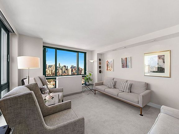 Perched high on the 26th floor, this sun-drenched residence boasts three exposures—north, west, and south—flooding the space with natural light and offering sweeping skyline views. Watch the sun set over Manhattan from the comfort of your own home.