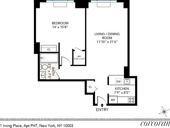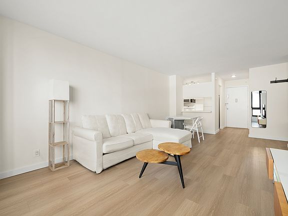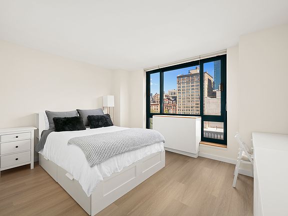 Inside this 672-square-foot home, tall ceilings rise above new wide-plank hardwood floors, fresh paint and huge windows framing views over Union Square and the surrounding skyline. Enjoy an expansive living room with plenty of space for seating and dining areas. The white-on-white pass-through kitchen is nicely appointed with rows of cabinetry and full-size appliances, including a gas range, dishwasher and built-in microwave. Sleep soundly in the spacious bedroom, featuring a convenient desk area and two closets, including a walk-in. The renovated bathroom impresses with a new glass shower, roomy vanity, wide medicine cabinet and handsome tilework. A large coat closet adds even more storage to this wonderful move-in ready residence.