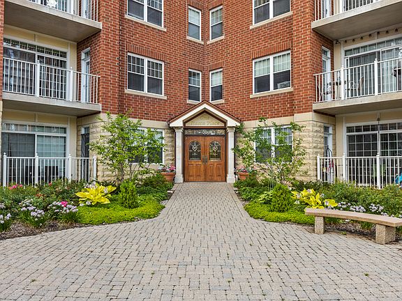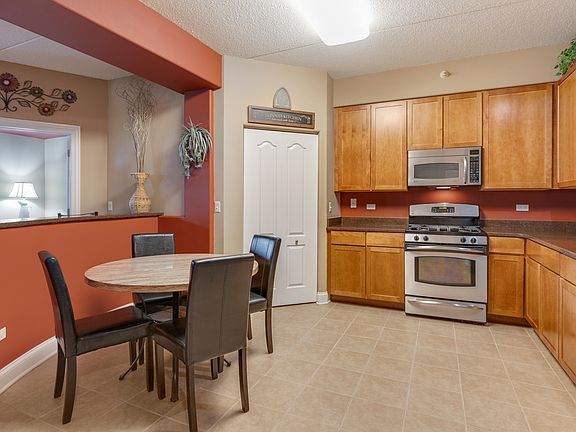 Live simply but elegantly. Unique floor plan that has den/guest room. Large kitchen with room for a table & chairs plus large granite semi-circle breakfast bar that can comfortably fit 6 bar stools. kitchen has 42" cabinets plus a walk in pantry. Living room has a door leading to a 11x5 balcony overlooking a pond/fountain. Bedroom has sliding glass door to balcony, two large closets including an 8x5 walk in and 12x12 bathroom that has a walk in shower plus a soaking tub. Hardwood floors in the living room, bedroom and den. Double glass doors are the entrance to the den that also has a closet. A separate laundry room with washer and dryer plus utility sink and counter. Powder room is enormous. Storage on same floor. Underground heated garage space (2088 upper level). Great location to major highways, Metra, O'Hare, golf course, restaurants and shopping. Meticulous building. Move right in!