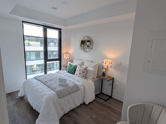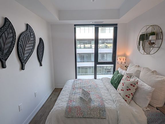 **Entertain yourself in style** with two bedrooms and one full bath. Featuring laminate flooring throughout, a contemporary kitchen boasting quartz countertops, and stainless-steel built-in appliances. The living area, bathed in natural light from floor-to-ceiling windows, seamlessly extends to the private terrace. The master bedroom is a serene retreat looking out to the terrace through the large window that invites in abundant natural light. The modern ensuite features custom cabinetry, quartz counters, and a designer vanity. The second bedroom also features a large floor-to-ceiling window.