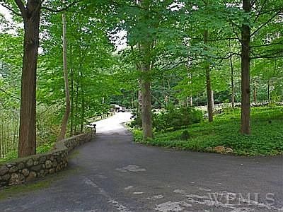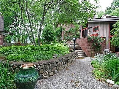 Architect's 4-bedroom home perches over deep gorge. Stone entry drive, dramatic rock ledge, running brook, mature trees, perennial flower gardens plus serene rear lawn for meditation or secure children play area. Solarium with 16' ceiling. Sky-lit vaulted living room with full wall built-in bookcases, wood burning fireplaces. Granite island center and glass cooktop in gourmet stainless steel kitchen. Master bath suite offers greenhouse view window, jacuzzi, sauna. Additional bath with skylights.