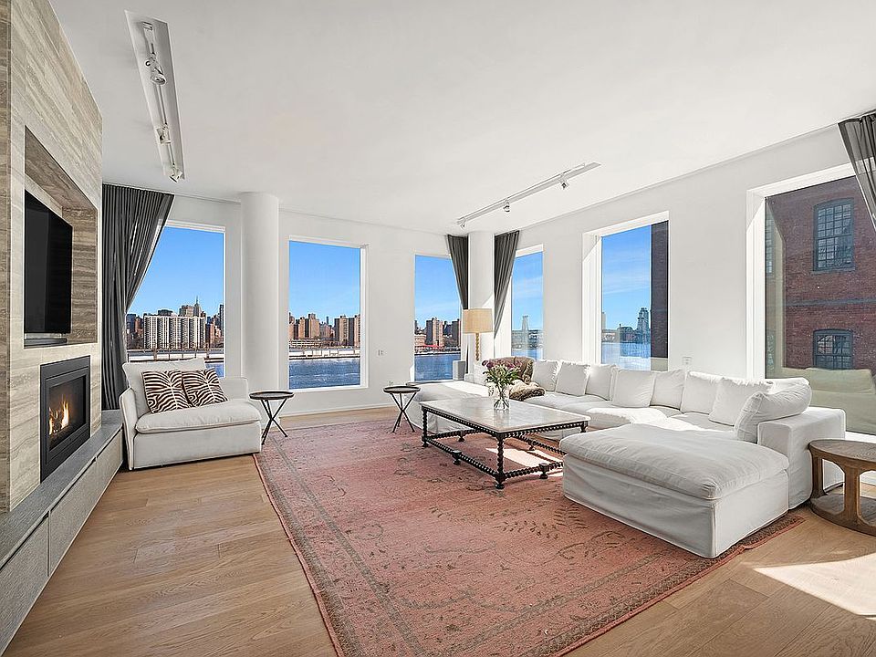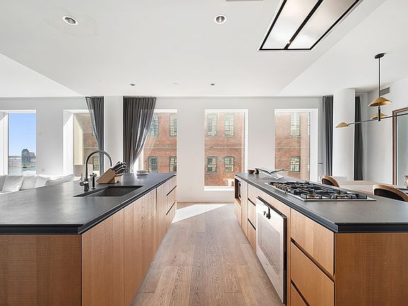 This expansive sanctuary boasts three bedrooms (converted by owners from a four bed), three-and-a-half baths, and a generous 2,400 square feet of living space floor-plan. Upon entry, you're immediately captivated by breathtaking 11-foot ceilings where walls of glass frame a mesmerizing view—the glittering East River perched against Manhattan's skyline. Magnificent 6-inch white oak flooring flows throughout the home. The kitchen transcends the ordinary, where form and function achieve perfect harmony. A prestigious Gaggenau suite commands attention, complemented by a whisper-quiet Bosch dishwasher. Dramatic honed Basaltina stone surfaces cascade over twin oak islands—an inspired centerpiece for both casual gatherings and elaborate entertaining. The dedicated eat-in area, sleek Cemento finished cabinetry, and brilliantly conceived storage solutions, including a chef's pantry.