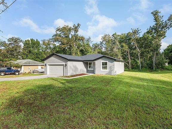 Welcome to this stunning newly built home, perfectly positioned on a desirable corner lot in the heart of Silver Springs Shores. Blending timeless design with modern elegance, this residence is sure to impress from the moment you arrive. Step inside through the covered foyer to an open-concept floorplan adorned with luxury vinyl flooring, a spacious dining area, and an inviting living room. The chef’s island kitchen is a true showstopper—featuring stainless steel appliances, quartz countertops, and a pantry that provides both style and function. The luxurious primary suite is a private retreat, highlighted by a custom barn door entry that opens to an oversized spa-inspired bathroom. Enjoy dual vanities, a massive walk-in shower with a classic rainshower head, and expansive walk-in closets designed to fit your lifestyle. Perfect for entertaining, the main living area extends seamlessly outdoors through 8-foot, three-panel sliding glass doors, leading to a patio which is ideal for weekend gatherings or relaxing evenings under the stars. Located in central Silver Springs Shores, you’ll enjoy close proximity to shopping, dining, and medical facilities. Don’t miss this rare opportunity to own a brand-new home in a prime location!