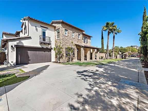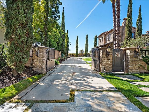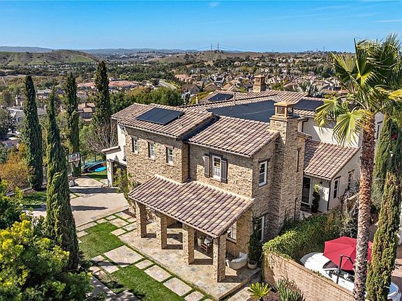 This hilltop oasis features panoramic valley, mountain and ocean views, a long gated driveway offering privacy and comfort at the end of a cul-de-sac street. Ideally situated on an oversized, corner lot with infinity pool, spa, outdoor kitchen, cabana and fire place. Extensive grounds with lush landscaping, palm trees, a mature fig tree, and tall spruce. Spacious floor plan includes six bedrooms, five bathrooms and one half bath. Newly renovated kitchen and laundry room, custom cabinetry, new Restoration Hardware lighting fixtures throughout, Viking appliances, double oven, custom hood and walk in pantry. Nothing was spared with the elevated finishes of this home. Primary suite offers private balcony, renovated primary bathroom, free standing tub, separate shower and two oversized walk in closets. Other rooms include movie theatre with adjustable leather recliners(optional 6th bed), large downstairs laundry with additional fridge and downstairs guest suite. Premium upgrades throughout. This property was re-pipped and has solar and is within minutes of the finest private and public schools in Orange County.