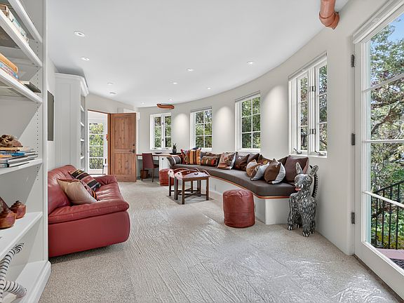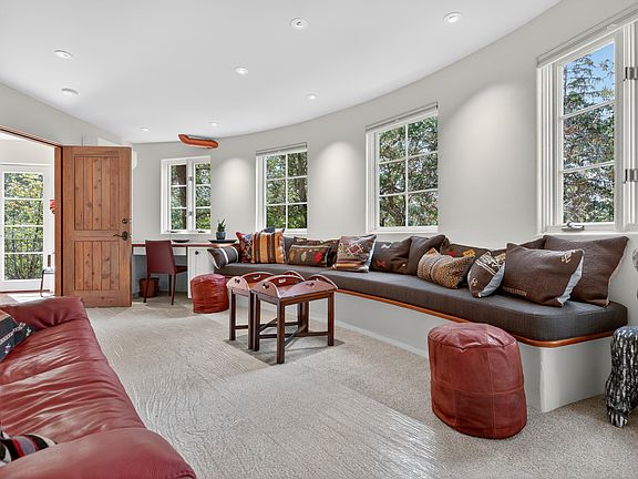 Family Room: built-in work space and lots of built-in shelves, a long window bench seating area and flat screen tv, carpeted