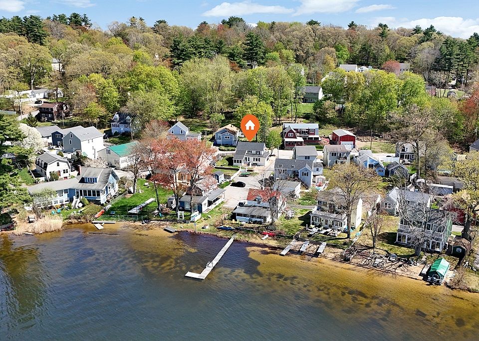 Wake up to water views and wind down with stunning sunsets over Lake Attitash. This Merrimac home is the ideal year-round lakeside retreat, set on a spacious fenced lot with water access just steps away. The open-concept main level features flexible living and dining areas, an updated kitchen with quartz countertops, subway backsplash and new appliances, plus a bonus first-floor room—perfect as an office or guest space. An enclosed three-season porch overlooks the yard and offers potential for future expansion. Upstairs, two bedrooms enjoy peaceful lake views. Recently updated with a brand new water heater (2024), plus a new roof and heating system (late 2023), this home is move-in ready. Hardwood floors, exposed beams, porcelain tile, modern fixtures, and a cozy wood stove add warmth and character throughout. Whether you're looking for weekend escape or full-time living, this lakeside home is ready to welcome you.