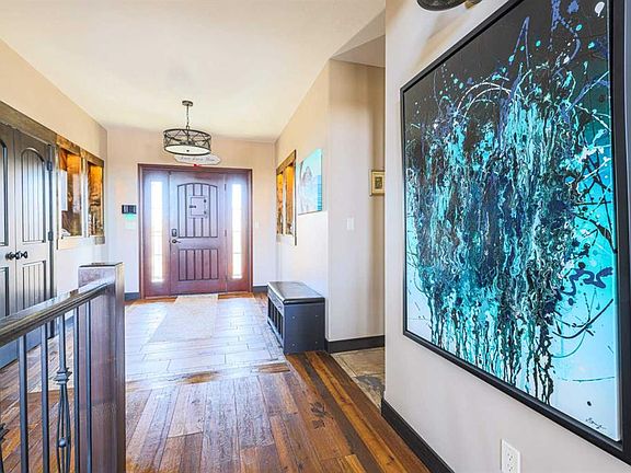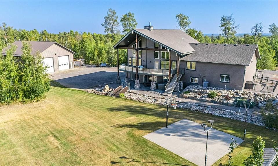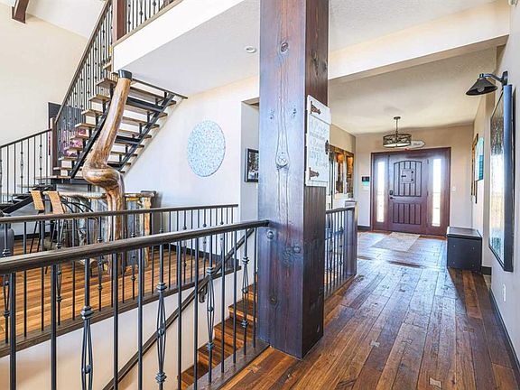 This custom built home offers acreage living at its finest. The moment you enter you’ll see many unique features from the open floor plan, wooden beams and a floor to ceiling rustic stone fireplace that makes you feel warm, cozy and glad to be home. Natural light pours in from floor to ceiling windows where you can enjoy the sunsets in your living room or downstairs in the extra large hot tub. There's a self contained one bedroom legal suite with all appliances including washer and dryer and separate entry in the walk out basement. Quality abounds throughout this stylish home featuring leather granite counter tops, reclaimed hardwood and ceramic tiled flooring, interior walls insulated for sound barrier, in-floor heating, custom designed bar with wood detailing, Fir Timber Frame design and so much more. This home really needs to be seen to truly appreciate the craftsmanship throughout. The large workshop (46 x 54ft) has in-floor heating, a mezzanine for additional storage, 14' doors and a full 3 piece bath that includes a washer/dryer. This professionally landscaped property with a quiet parklike setting and beautiful view of the mountains has something to offer every family.