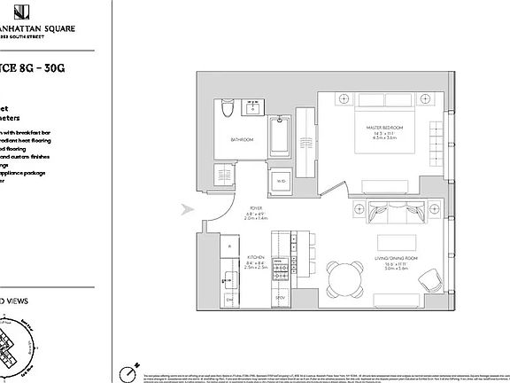 This One Manhattan Square residence 18G is on the 18th floor, around 723 square one bedroom, one bathroom with an open gourmet kitchen and breakfast bar.
