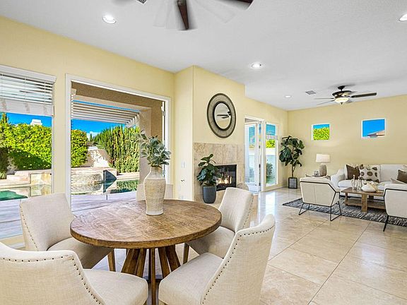 Discover luxurious living in the heart of Rancho Mirage with this stunning 3-bedroom, 3-bath home in the desirable Versailles community. This redesigned Baroness floorplan offers 2,442 sq. ft. of elegant living space on a lot over a quarter-acre, tucked away on a quiet cul-de-sac. Enter through a custom wrought iron gate into a spacious courtyard with backyard access. Inside, 10-ft ceilings, skylights, large art walls, oversized picture windows, and glass-inlay French doors fill the home with natural light. The open great room features a cozy fireplace and views of the resort-style backyard, complete with a Pebble Sheen pool and spa, extended patio, and Alumawood cover for shaded comfort.The gourmet kitchen boasts sleek black appliances, granite countertops, and a raised bar with pendant lighting. The primary suite includes French doors to the backyard, a spa-like en-suite with a soaking tub, dual sinks, and a walk-in closet. Additional features include Travertine flooring, plush carpet, recessed lighting, a laundry room with granite counters, and a 3-car garage. Located in IID for reduced electric costs, this gated community offers tennis and sports courts, sidewalks, individual mailboxes, street lamps, and low HOA dues covering cable TV and high-speed internet. Close to shopping, dining, and schools, this home combines style, comfort, and convenience. All marketing information is reliable but not guaranteed. Buyer to verify all marketing information.