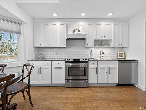 Inside, hardwood floors flow throughout the home, creating a warm and inviting atmosphere. The kitchen boasts white cabinetry, granite countertops, stainless steel appliances, and a gracious eat-in area filled with natural light from a front-facing window and skylight. Two large pantry closets provide ample storage, and the convenient laundry area is located just off the kitchen.