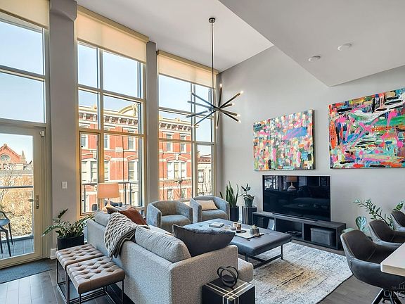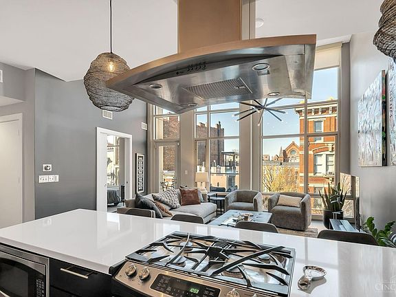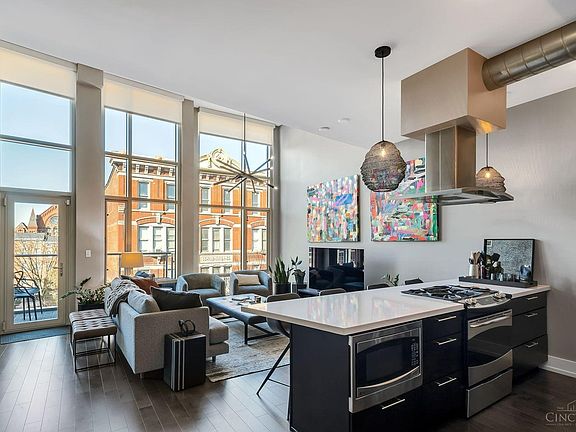 Stunning!! Live downtown in style in this amazing condo featuring 2 beds and 2 full baths with garage parking. Top-floor unit boasts extra-high ceilings with a breathtaking 14-foot wall of windows overlooking Vine St and the iconic Music Hall. Step out onto your own private balcony and soak in the fantastic views. Extras include custom shelving in the kitchen & closets, spacious kitchen, freshly painted throughout, cool updated lighting and specially UV tinted windows for sun protection and privacy. Laundry in-unit means no more laundromat trips, elevator in building, & an additional storage locker are added bonuses. Take a quick stroll to Washington Park, the Banks & then explore downtown Cincinnati's & OTR's coolest restaurants & entertainment hotspots located just outside your front doorstep! Dedicated garage parking for just $137/month! Don't miss this one!