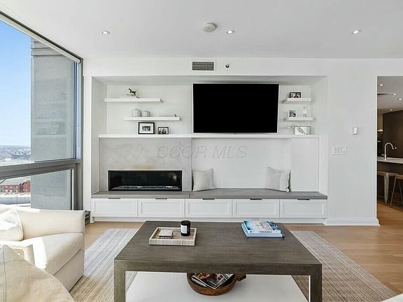 Stunning 19th floor corner-unit in the desirable Miranova building in Columbus! Offering 2 bedrms, 2 bathrms and 1,700 sqft of living space with breathtaking views of the river & downtown from two walls of floor-to-ceiling windows. Completely renovated, this condo features an open layout with a high-end kitchen complete w/custom cabinetry, quartz countertops, Thermador range & dishwasher, SubZero paneled-fridge & 2 fridge drawers + tons of storage. Gorgeous built-ins + fireplace in the living rm that opens to the kitchen, dining area & private balcony! The primary bedrm boasts ensuite w/double vanities, soaking tub & 2 closets! Includes 2 parking spaces + storage rm! Miranova offers 24/7 doorman & concierge services, resident lounges, fitness facility, swimming pool, guest suite & more!