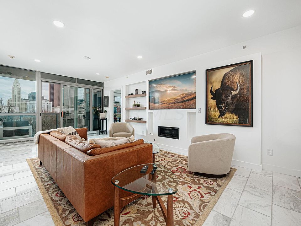 Central Ohio's premiere high rise. No detail has been left undone in this incredible condominium. Marble floors throughout. Floor to ceiling views of downtown Columbus. 2 full bathrooms, office or guest room with opaque glass walls. All new kitchen appliances, new plumbing fixtures, electric updates and more. Fireplace wall and shelving complete the renovation. Large balcony. Large closets with custom shelving. The services at Miranova are first class, concierge, security, workout room, pool, conference room and guest suite available. Easy access to the bike path and Scioto mile.