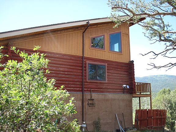 Rustic log home with views. All electric with solar panels, 8Kwatts, electric bill with single resident = $20.. Water haul with 1,000 gallon water storage. Had well inspection. Has water but pump burned out. First floor, 2 car garage, bedroom, full bath. Second floor, main living with pellet heater, kitchen, 2nd bedroom, and primary bedroom with custom designed bathroom. Third floor loft. Outside west facing deck, Awesome views of Sandias.