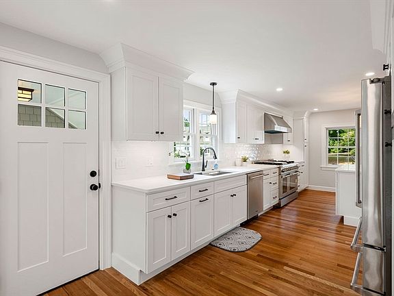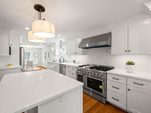 This beautifully expanded cape is ideally located near Lynch Park, Brackenbury Beach, and the Cove Community Center. The inviting open floor plan is perfect for modern living and entertaining. The heart of the home features a newly renovated chef's kitchen with THOR stainless steel appliances, including a 6-burner gas stove with griddle, custom cabinetry, and elegant quartz countertops. The living room boasts a cozy fireplace, seamlessly connecting to the dining area with custom built-ins. A dedicated home office suite with a beverage station adds versatility. The second floor offers two oversized bedrooms, each with full baths, ensuring comfort for family or guests. The primary suite is a true retreat, complete with a luxurious tiled bath and sitting area. Set on a corner lot, the property includes a paver driveway and one-car garage. Don’t miss this opportunity—schedule a viewing or join us for an open house on Sunday, September 29th from 11 AM to 12:30 PM!