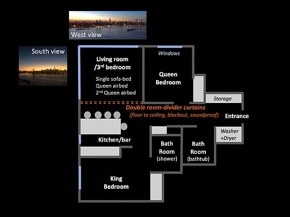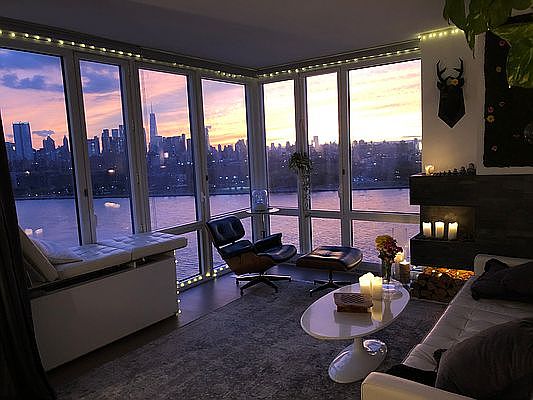 SKYLINE + WATERFRONT + SUN Furnished from October 15, 2021 to May 30th 2022 The best view of Manhattan skyline you can get in. On the water: no street below, zero traffic noise, open the window and hear the waves Facing South/West: direct sun from noon to sunset. FULLY FURNISHED WITH MID-CENTURY DESIGN Eames lounge chair Saarinen Tulip coffee table Florence Knoll leather Sofa + Bench + Custom window seat Glass desk + 2 Apple screens (for laptops) King-size bed with top quality pillowtop spring mattress (medium firm) Queen-size Wall bed with spring mattress One large TV set in each bedroom 3 large mirrors 4 bar stool chairs Living room can be turned into a 3rd bedroom for guests (soundproof full privacy room divider curtains+ queen size airbed). FULLY EQUIPPED High-speed internet Verizon FiOS Washer, Dryer, Dishwasher, Fridge, gas oven, micro-wave oven Roomba Vacuum robot, 2 TV sets with 2 Apple TVs All kitchen utensils and dishes AMENITIES Gym Outdoor Pool (May to Sept), 24/7 doorman, Dry-cleaning, , etc. Barbecue, cinema screen Media room with billard Business center (desk, internet, printer...) PARKING In the building (not included, you can pay per hour, day or week) In the street for free (not alternate side parking in a couple of streets nearby) PARKS Domino Park on the left East River park (Smorgasburg, concerts) on the left TERMS No pet No smoking Annual Income = 40 times monthly rent 3 times monthly rent available on checking account 1 month deposit + 1st and last month paid in advance The approval process and lease drafting is provided by the building manager ALL INCLUSIVE $800 monthly fee (NOT INCLUDED IN THE RENT) for furniture, internet, electricity, gas, water, amenities.