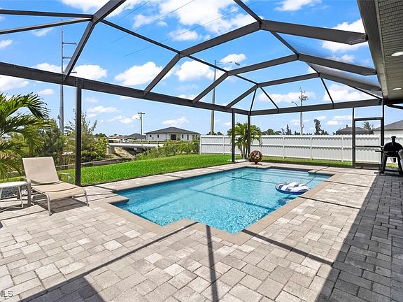 You've got to see this one before it's too late. Stunning and Contemporary canal front home in great location. The salt water pool is heated with pool cage and picture frame screens to enhance the views of the Hermosa canal. There is so much to love about this home. The huge covered lanai, outdoor kitchen, fully fenced yard and totally upgraded interior is just the beginning. The great room is a totally open plan with recessed ceilings, wood beams and great views. It's on city water and sewer with all assessments paid at closing. It's not in a flood zone, so no Flood Insurance required here. The seller is offering $2,500 towards the buyers closing costs. There are three large bedrooms plus a great den/office, 3 full baths including a direct access pool bath. There is an amazing primary suite with recessed ceilings, two walk-in closets, a luxurious bath with soaking tub and separate shower, plus a second guest suite with direct access bath. The kitchen is a chef's dream with two tone custom cabinets, quartz counters with oversized waterfall island, upgraded Frigidaire Stainless Steel Gallery appliance package, built-in microwave and separate vent hood, a wonderful pantry and frosted glass accent cabinet doors. The laundry is large with cabinets above the laundry area, a laundry sink and built-in storage area with shelves. The home also has hurricane impact windows/doors, 8ft. interior doors and sliders, and an Impressive 8 ft frosted glass double door entry. One of the best things about this home is the central location, just minutes from the Pine Island shopping corridor. It's back yard and covered lanai face north which is a great to enjoy the wonderful sunrises and sunsets over the Hermosa Canal. This home checks all the boxes, it's a must see.