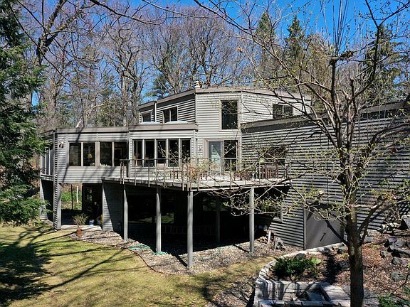 This contemporary North Oaks home has Frank Lloyd Wright inspired elements. Beautiful architectural details both on the interior and exterior are designed to offer expansive views of nature and abundant space for your art and books. The entire home is simultaneously artful yet warm and cozy. Varying ceiling heights create defined spaces with an abundance of natural light. One whole wall is treated as an art piece. Five bedrooms and two offices provide the necessary space. Additional garage and workshop area underneath the main level garage. The craftsmanship and attention to detail will not disappoint.
