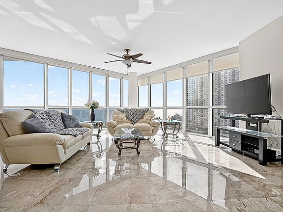 Wake up to an ocean sunrise from floor to ceiling windows in every room of this spacious 3-bedroom 2.5 bath home. The 2,108 sq. ft. interior offers 270 degrees of unobstructed views of the ocean, city, and Plaza fountain from its uniquely shaped living room, exclusive to the -06 stack. Immaculate Italian marble floors span the entire space, even extending to the 300 sq ft glass balcony. This turnkey retreat combines unmatched views, exquisite finishes, with smart versatility.