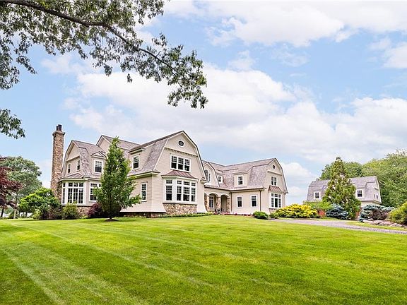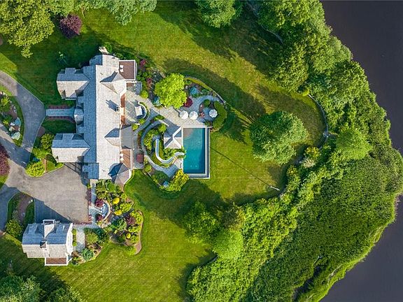 For those seeking an extraordinary place to call home, One Old Farm Road offers an exceptional opportunity. Tucked away down a winding drive, this custom-built cedar shingled home sited on 50+ acres of waterfront land is nothing short of spectacular. The main house offers 9,000 s.f. of refined living space, with five bedrooms, five full bathrooms, and two half bathrooms. Custom details grace every room. The living room features a two-story fieldstone fireplace, and the chef’s kitchen has custom cabinetry and a breakfast nook with built-in seating. The formal dining room, game room with bar, screened-in patio, media room, and library with walnut paneling and coffered ceiling round out this level. The second floor features a primary suite with sitting area and spa bathroom overlooking the river. An additional four bedrooms and bathrooms, and a generous laundry room, complete this floor. On the walkout basement level, you’ll find the wine cellar and finished space with access to the patio and pool area. Bluestone patios, outdoor kitchen, and infinity pool with waterslide provide endless opportunities for entertaining. The 1,248 s.f. guest space separate from the main house is the perfect au pair or in-law cottage, with two bedrooms and a full kitchen and bathroom. With geothermal heating and cooling, this is a home where there is nothing to do but enjoy. A short drive from Routes 24 and 195, the seclusion of this property creates a feeling of being worlds removed from it all.