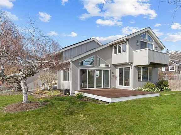West facing contemporary sitting on one of the highest points on Overlook Drive with water views of Bristol Harbour and spectacular sunsets. Filled with natural light, this four bedroom three and a half bath home features vaulted ceilings and an open floor plan with the perfect flow for entertaining. The open floor plan enjoys an abundance of natural light along with soaring vaulted ceilings in the living room, gleaming hardwood flooring, a spacious dining room with picture window and family room with a gas fireplace. On the second floor there is a wonderful primary suite featuring; a private balcony, walk-in closet and updated bath with an oversized shower and soaking tub. Finishing off the second floor are three bedrooms and a family bath with washer and dryer. The finished lower level has a full bath, craft room, walk -in cedar closet, utility room with work area and a bulkhead. The fenced in backyard has been beautifully landscaped with irrigation. There is plenty of room in the three car garage with lofted storage. New roof with efficient solar panels (owned.) Enjoy watching the activity in the harbor, as well as the July 4th fireworks from the side deck. Enjoy the epitome of coastal living with convenient access to all the shops and restaurants in town, as well as Colt State Park, Bristol Harbor and the nearby East Bay bike path.