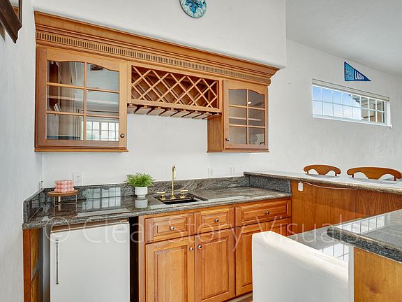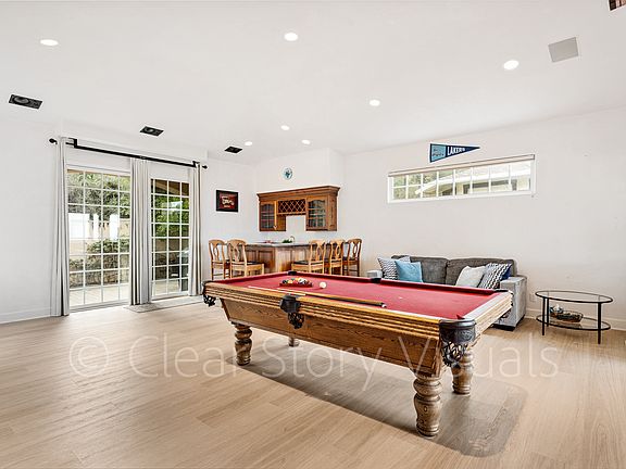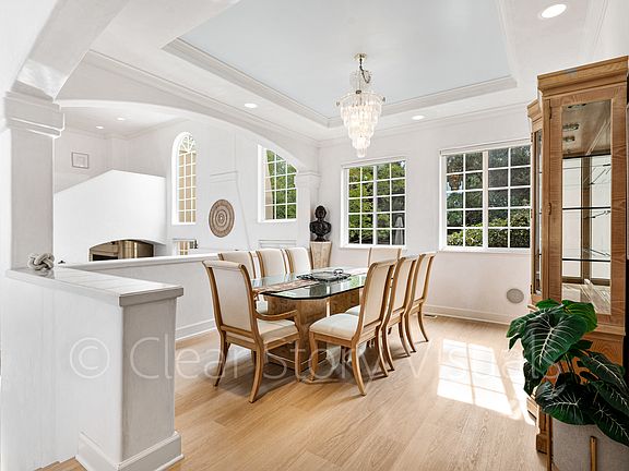 Bathed in natural light through large windows, this home features high ceilings, Venetian plaster walls, and three fireplaces for cozy evenings. The spacious layout includes a formal dining room, living room, family room, and game room with a pool table and bar, perfect for entertaining. The chef's kitchen is fully equipped and generously sized, featuring panoramic windows that frame the ocean, along with recently refinished wooden cabinets that showcase the natural beauty of the wood.
