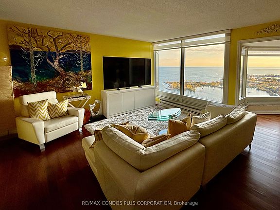 Palace Place redefines waterfront luxury with an unmatched resort-style lifestyle, offering first-class services and amenities that set the gold standard in Toronto living. This rare and expansive 1,491 sq. ft. suite, one of only 15 of its kind in the building, boasts two oversized bedrooms, two full bathrooms, and a sunlit solarium ideal for romantic dining, all complemented by rich wood flooring, stainless steel appliances, and a spacious in-suite laundry room with ample storage. Every window frames spectacular southwest views of Lake Ontario and the vibrant New Humber Bay Etobicoke waterfront. Enjoy the ease of all-inclusive maintenance fees, plus parking and a locker. Residents indulge in exclusive amenities including a private shuttle to Union Station and local malls, valet parking, a state-of-the-art fitness centre, indoor saltwater pool and spa, dry and steam saunas, a sky lounge, elegant party room, and games lounge with table tennis and billiards. Ideally situated on the shores of Lake Ontario, with effortless access to parks, shops, dining, medical services, airports, downtown Toronto, and major highways.