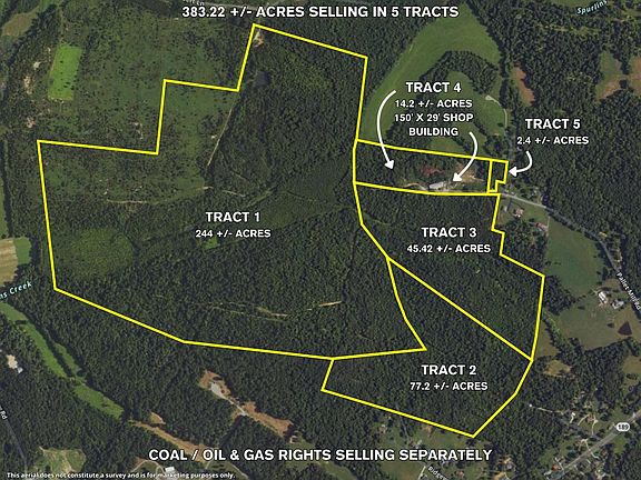 Auction!! Onsite at 801 Pallet Mill Road on Saturday, October 25th at 10:00 AM. 383.22 +/- acres selling in 5 tracts. Coal and oil & gas right are selling separately. This listing is for Tract #1: 244 +/- acres with ponds, creek and mature trees. Call today for more information! Bidding opens at 10:00 am on Saturday, October 25th at 801 Pallet Mill Road. All bidders must be at least 18 years of age. A 7% buyer's premium is added to the high bid to determine the final sale price of real estate. Winning bidder will be required to sign a Real Estate Auction Purchase Contract and pay a 10% down payment deposit day of auction. Real estate is being sold by deed, as-is, where-is with all faults. Closing to be on or before November 24th, 2025.