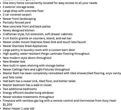 Welcome to your next home! Just under half an acre with a park-like setting and FLAT backyard. The patio is perfect for entertaining and watching the birds! Inside features 3 bedrooms, 2 bathrooms with a open concept living area and kitchen, ventless gas fireplace, light filled sunroom and wet bar perfect for your coffee or tea station. Enjoy the large workshop. The covered two car carport could easily be converted to a 2 car garage. Already connected to city sewer! Water heater- 2024, New roof to be installed at closing. The two garden beds do not convey. See attachments for more upgrades and information.