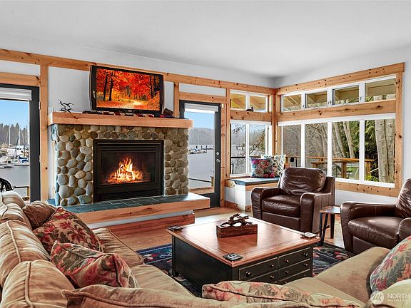 Beautiful & serene, this waterfront home is one of a kind situated right in the beautiful Port Ludlow Bay Marina. Beach life plus excellent potential for rental income, guests or multigenerational living. Apartment above detached garage offers private entry, kitchenette, living, sleeping area & bath. Main house features gorgeous open living space with exposed beams, knotty wood & giant stone fireplace. Step right out to the fabulous covered and heated deck. Cozy den with office space. Upper level boasts primary bedroom, w/ fireplace, spa tub, expansive views of Marina, plus additional bedroom & bath. Minutes to Port Ludlow Inn, Golf Club & Trails. STR allowed! Zoned MPR-RC/CF - Master Planned Resort - Resort Complex/Community Facilities.