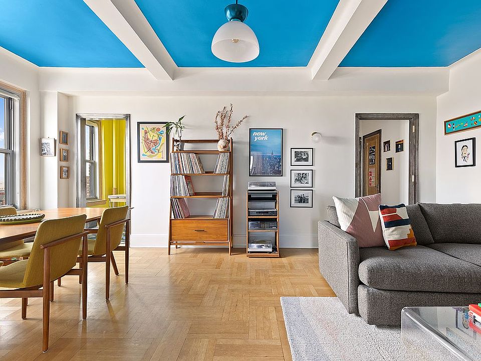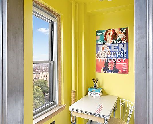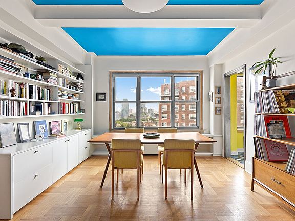 With 9-foot beamed ceilings and a wall of windows, the living room is bright and airy, showing off beautiful hardwood floors and built-in shelving. The bedroom's corner layout with multiple windows offers amazing panoramic views of all five boroughs and the statue of liberty, making it a fantastic place to unwind. Plus, there’s plenty of closet space and original built-ins, all smartly designed for maximum storage.