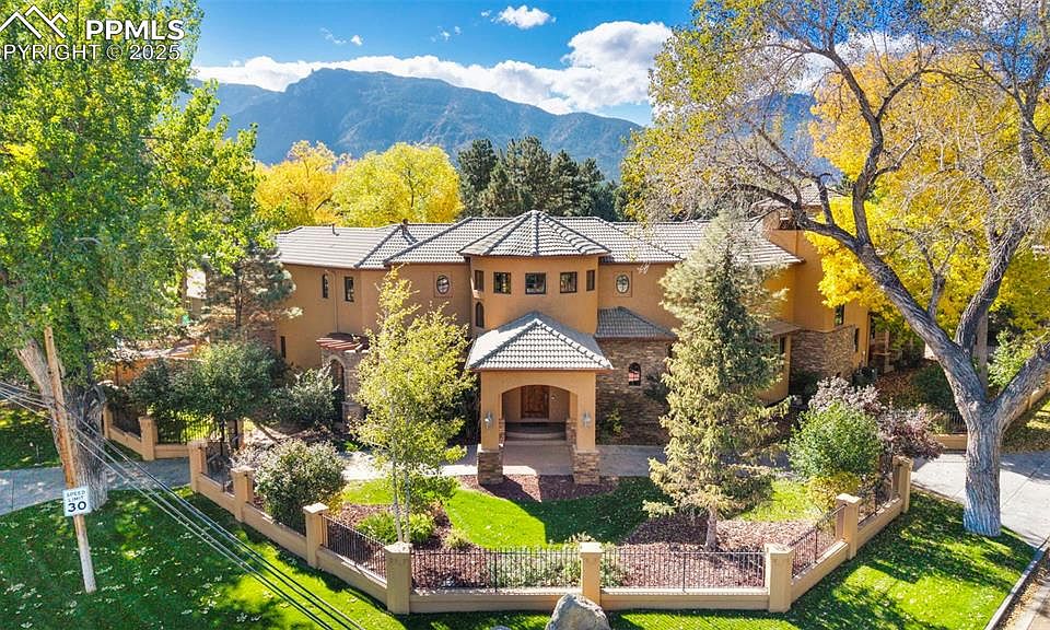 Architectural Brilliance in the Heart of Old Broadmoor Perfectly poised on a .62-acre lot with sweeping mountain views, this extraordinary custom home embodies timeless elegance and refined craftsmanship. The soaring vaulted foyer welcomes you with an elegant curved staircase and rotunda, setting the tone for the architectural splendor within. Every bedroom is ensuite, showcasing luxurious amenities and a chic aesthetic throughout. The home features two master suites, each with exceptional custom closets, tile surfaces, travertine floors and spa-inspired bathrooms designed for indulgence. The gourmet kitchen is a showpiece—appointed with high quality appliances, slab granite surfaces, and hardwood floors—opening gracefully to a comfortable sitting area and sun-filled dining alcove. Expansive windows illuminate a piano-ready alcove, creating a perfect balance of warmth and sophistication. The upper level is an entertainer’s dream, offering a large theatre room, game area, and a fabulous wet bar. A well-appointed office with multiple built-in desks adds both style and function. From this level, enjoy multiple patios with stunning views, ideal for relaxing under Colorado’s endless skies. A distinctive portico connects to two separate 2-car garages, providing private and convenient access to the home. The residence is further enhanced by beautiful stonework, Alder and Cherry wood details, a dramatic catwalk to a private ensuite bedroom, new paint, and newly refinished wood floors. Enjoying the outdoors is an essential part of the Colorado lifestyle, and this remarkable yard—complete with a convenient private well—is no exception. The outdoor fireplace and built-in grill create an inviting ambiance for gatherings, while the expansive, level lawn and stunning mountain views provide the perfect backdrop for relaxation and entertaining. A true masterpiece of design, comfort, and craftsmanship, this Old Broadmoor treasure celebrates luxury living in every sense.