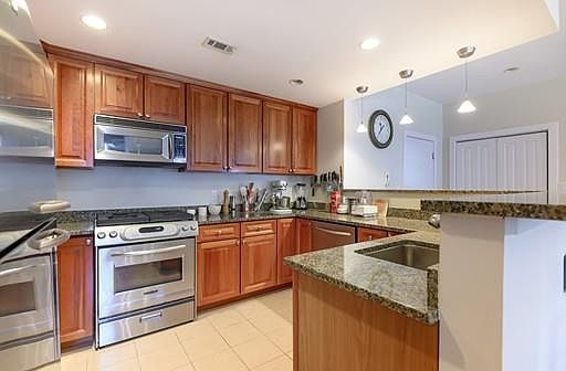 - Kit Dscrp: Countertops - Stone/Granite/Solid, Flooring - Stone/Ceramic Tile, Breakfast Bar / Nook, Recessed Lighting, Stainless Steel Appliances, Lighting - Pendant