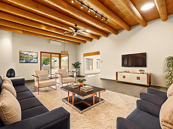 Priced to Sell! Potential multigenerational living. Expansive contemporary pueblo, split bedroom open plan design with high ceilings throughout. The main home includes a formal dining area, spacious great room with kiva fireplace, a large primary suite with kiva fireplace, large walk in closet and spa-like bathroom. Excellent separation from the two guest bedrooms and bath, plus a den/study. The kitchen has been remodeled including an induction range top, custom lighted cabinetry and pantry. The radiant heating is supplemented by 5 mini splits to keep a comfortable temperature summer and winter. There is a large heated storage room/workroom for hobbies and toys plus an oversized 2 car garage. Behind the home sits a detached 478 sq.ft. heated 2 room studio/guest with a 3/4 bathroom for extra guests/office or studio with a separate septic system. A lovely walled garden with a 3rd kiva fireplace for enjoyment plus a large portal for morning or evening outside entertainment. Enjoy the historic railway and rail trail bordering the back of your land. Plenty of guest parking with a paved driveway and easy access to Eldorado amenities, local shopping only minutes into Santa Fe.