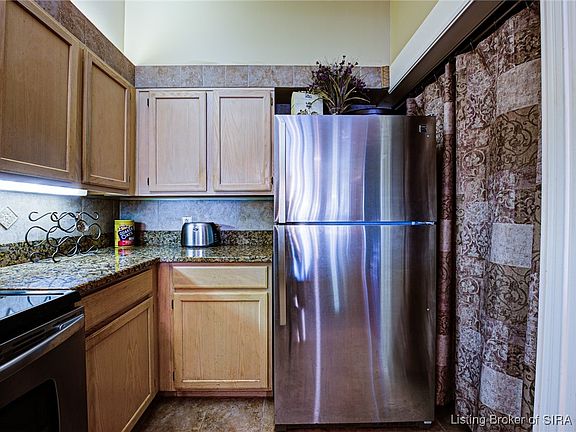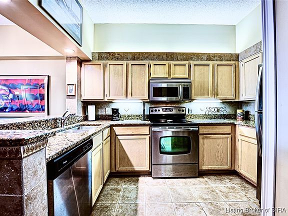 Welcome to THE HARBOURS Condo 314 – Beautiful Views of the Louisville Skyline & Ohio River! One bedroom , 1 bathroom condo in this sought after community with the convenience of the heart of Downtown Jeffersonville. Kitchen features, granite counters, tile floors, stainless appliances & a bonus pantry beside the fridge. Living has laminate floors, ceiling fan & sliding door to your private balcony. The Primary bedroom has plenty of room for a sitting area & slider to the balcony. The bath features upgraded double bowl vanity, tile floors & walls, walk-in shower & linen closet. This floor plan has a full laundry room that also provides extra storage. Washer and dryer stay as well as patio furniture. Bonus included in this 1 bedroom unit, two Deeded covered side by side parking spaces 334 & 335. Water Heater Dec 2024; HVAC 2018. THE LOCATION for THUNDER OVER LOUISVILLE! Neighborhood includes multiple restaurants & entertainment options. The Harbours is a premier property with gated entries, fitness center, indoor & outdoor pools, grills on-site, patio/gazebo areas. Monthly HOA covers amenities, cable, high speed internet, HBO, Showtime, water, sewer, trash, water softener & master insurance. We Have the View!