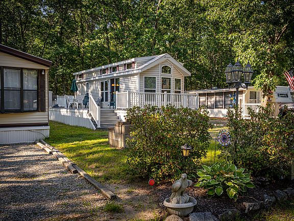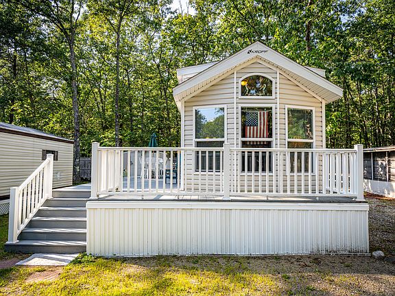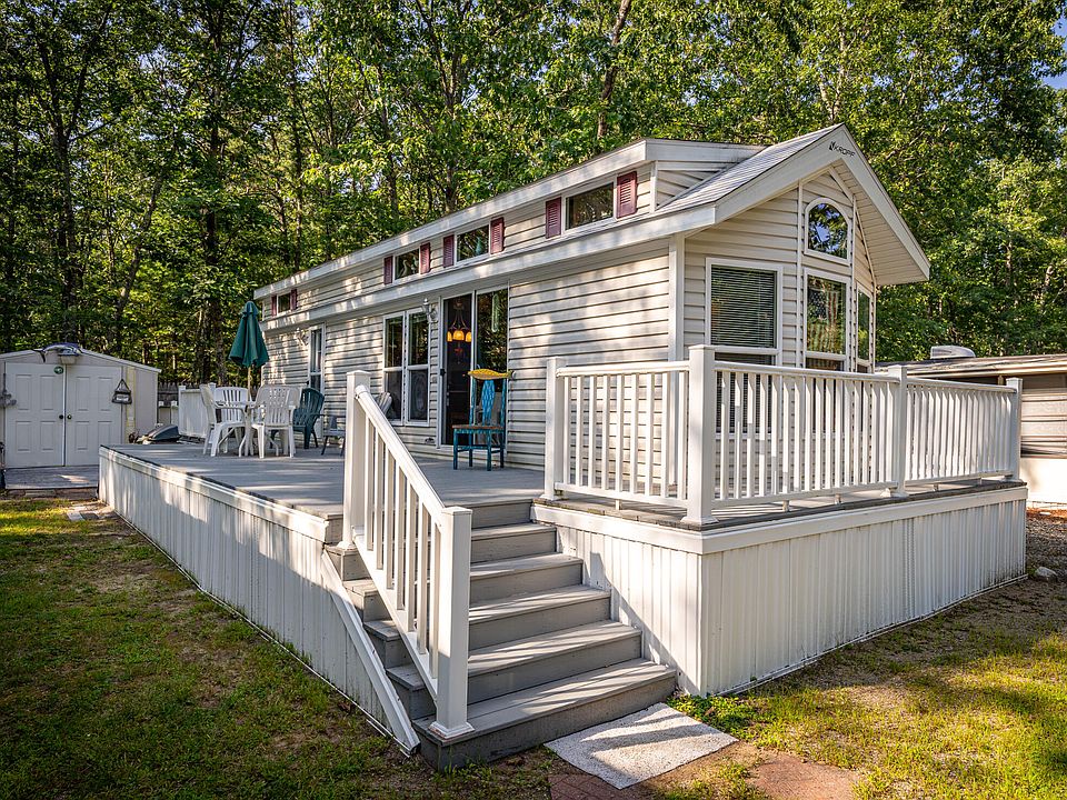 -Are you looking for your affordable Maine summer campground-style retreat? This 2016 Kropf park model manufactured home is located in a West Kennebunk RV resort full of amenities plus access to the Mousam River and a shared dock! Other YankeeLand resort amenities include a pool, pavilion, basketball & pickleball courts, playground, laundry facilities and more. This park model is located on a nice lot without neighbors behind it and boasts one of the largest 3-sided wraparound decks in the park! Cathedraled throughout with transom windows for a natural light and a sense of spaciousness, you'll find an open plan living room with a sleeper sofa, dining room & kitchen area. The kitchen offers a full-sized gas range, double sink, decent sized fridge, lots of cabinets and a peninsula. The full bath offers a regular-sized vanity and tub/shower combo, and the queen sized bedroom is located at the rear of the unit for the most privacy. This lovely park model is being offered fully furnished, right down to the grill, shed, dishes, and silverware! This unit has ducted heat and air conditioning, plus thermopane windows for comfort and efficiency throughout the season, and it was delivered new to this site. Golf carts, visitors and pets are welcome in the park, and there's many events throughout the season to take part in: golf cart parades, movies, food trucks, and even Christmas in July. The season runs from May 1st to the 2nd week of October. Come take a look and see how close this is to all Kennebunk and the southeast coast of Maine has to offer!