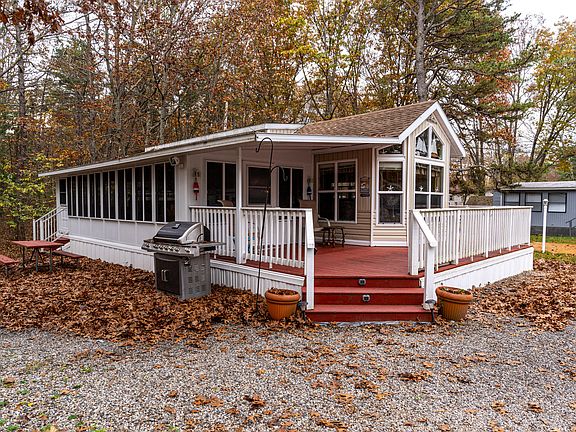 Are you looking for a Maine summer campground-style retreat with it all? This Breckenridge park model is located in a Kennebunk RV resort full of amenities plus access to the Mousam River and a shared dock! Other YankeeLand resort amenities include a pool, pavilion, basketball & pickleball courts, playground, laundry facilities and more. This unit is located on a premium corner lot - no neighbors behind, and one of the largest outdoor spaces on a site! There is an oversized shed with electricity, a big fire pit and even a large patio! The spacious gated porch leads to an oversized, 12 ft wide sunroom wired for surround sound, that offers a larger dining area & sleeper sofa for guests. Inside the unit, you'll find the front half cathedraled, with transom windows for natural light and a sense of spaciousness. The open plan front end has a living room area with 2 sleeper sofas, a built-in office desk, multiple cabinets and a divider for privacy for the very front. In the center there's a dining nook & kitchen area with a full-sized gas range, double sink, decent sized fridge, many cabinets and 2 peninsulas. The bath offers a regular-sized vanity and shower. The queen-sized primary bedroom with a large closet and more storage is located at the rear of the unit for the most privacy. But wait - there's more! Rarely seen in this park, this unit also boasts a loft and a half for 2 more sleeping areas for the younger crowd. This lovely park model is truly turn-key, offered fully furnished inside & out with many extras. The park model has heat and air conditioning, plus thermopane windows for comfort and efficiency throughout the season. Lots of room for your guests and pets that are welcome in the park, with many events throughout the season: golf cart parades, movies, food trucks, and even Christmas in July. The season runs from May 1st to the 2nd week of October. Come see how close it is to all things Kennebunk!