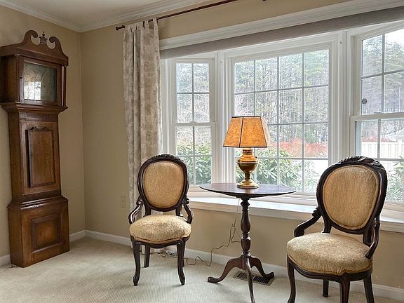 At the Old Common in Peterborough, an end unit townhome that rarely comes to market. When you enter through the front door, you will find the front-to- back living room -- exceptionally spacious, it features lots of light, a wood-burning fireplace and access to the four season sunroom. The sunroom has beautiful wood floors, floor to ceiling light, heated by a pellet stove --it's a perfect place to read in the winter and enjoy the breeze in summer. To the left of the front door, you will find a lovely dining space, with a bay window, hardwood floors and open to the kitchen. The kitchen offers lots of prep space -- long counters, good cabinet space and a center island. A half bath with laundry complete the main floor. The second floor features a rather unique primary suite -- a large bedroom, a separate office space, an exceptional walk-in closet and a generously-sized bath with a double sink vanity. Two additional bedrooms and another full bath complete the second floor. The basement -- currently unfinished, allows for lots of storage. A one car garage has direct entry to the home. Amenities include central air conditioning, a tennis/pickle ball court and a pool. Located close to Peterborough center, you will find casual and fine dining, theatre, an independent bookseller, an excellent library, local shops, a thriving arts community and the nearby hospital.