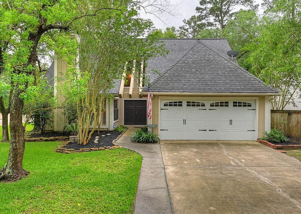 Amazing location, just 2 miles to I45 and all of the amenities The Woodlands has to offer! Impressive double front door entry leads to bright and cheery living area with soaring ceilings. Upper windows with remote controlled shades to easily control the light. Many beautiful updates in this home including hand-scraped wood flooring throughout main living area and master bedroom, tiled entry and kitchen, wrought iron stair case, updated bathrooms, enlarged master closet, recently replaced roof. 1st floor Master suite with 3 generously sized bedrooms upstairs plus 2 additional \"bonus rooms\" for storage or kids play space. Full sprinkler system, backyard deck, beautifully treed corner lot!