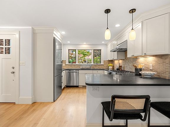 Luxurious Townhouse in Professor's Row just 5 blocks from Harvard Square. Hardwood floors, gas fireplace, cathedral ceilings, skylight. Open concept kitchen with black granite countertops and marble backsplash, luxury stainless appliances incl. pull-out microwave and Wolf Range, peninsula bar w/ pendants flowing into the dining room, 1/2 bath. Second floor has 3 bed/2 baths with limestone floors/shower/tub and marble vanities. Sunny Primary Suite features en suite bath and walk-in closet. Finished basement has h/w floors, office/guest room, spacious laundry. Private 300+ sf patio, rooftop deck. Unit was gutted and rebuilt in 2011/2012. Central A/C, 1 car garage plus permitted street parking. 86 and 88 bus stop one block away, Red Line T stop in Harvard Square. Restaurants/Starbucks/Whole Foods starting within 2 blocks.