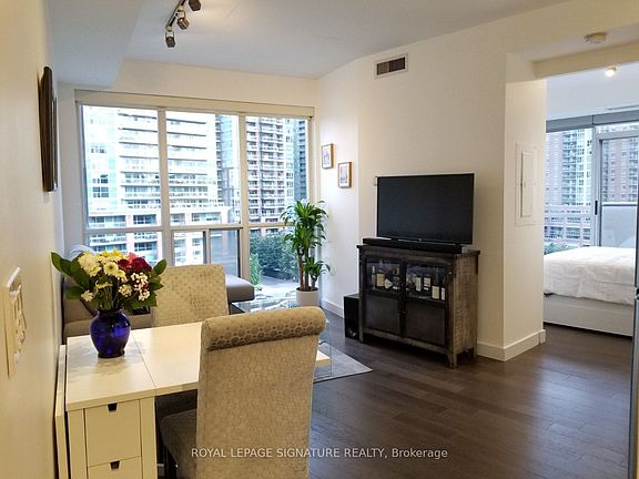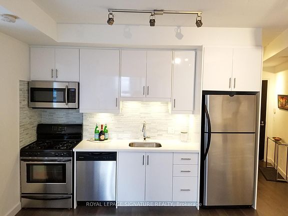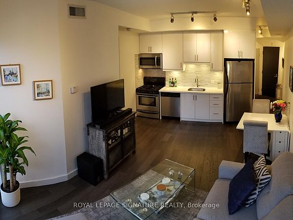 Welcome to this gorgeous 1-bedroom corner unit in the iconic DNA 1 residence where stylish city living meets everyday comfort. Bathed in natural light thanks to its sunny southwest exposure, this bright and renovated open suite features modern finishes throughout, including fully renovated kitchen, stainless steel appliances, a gas range, sleek hardwood floors, and a luxurious fully renovated 3-piece bath. Soaring 9' ceilings and expansive floor-to-ceiling windows in every room offer stunning views and unforgettable sunsets. The spacious bedroom boasts double juliette balconies and wraparound windows for an airy, light-filled retreat. Live in the heart of vibrant King West-just steps from acclaimed restaurants, buzzing nightlife, scenic parks and trails, Queen West, the waterfront, BMO Field, Budweiser Stage, and more. Easy access to TTC and Gardiner makes getting around a breeze. Amenities such as concierge, bike storage, communal BBQs, party room, gym, visitor parking and rooftop terrace with dining, lounge and hammocks included! Please note: photos were taken prior to current tenant.