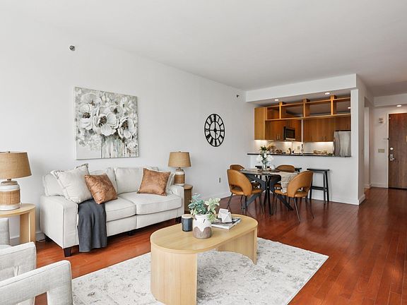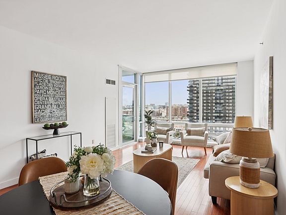 Floor to ceiling windows, open floor plan dining/living, hardwood flooring, private balcony, chef's kitchen with SS appliances, quartz countertops, customized window treatments are of the many features this unit offers. In-unit washer/ dryer. Balcony with beautiful views around the seasons.