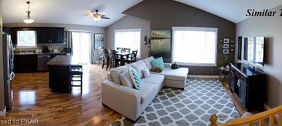 This new home is just waiting for its new family! Nestled amongst the trees on almost half an acre is this welcoming 3 bdrm/2 bath home with crisp clean lines. The large foyer maintains traffic and has a patio door to the rear deck. The bright, sunshiny great room boasts a cathedral ceiling, a patio door to a side deck and panoramic views from windows galore. The open kitchen is appointed with specialty mouldings, pan drawers, an independent work station designed to accommodate bar stools, plus a heavy duty pantry. Beautifully sized bedrooms with the master having an ensuite plus a walk-in closet. The double car garage gives easy access to the home and it too has a patio door to the rear deck. The lower level has large windows and high ceilings with a roughed in future bath and a walk-out to the rear yard with a privacy fence. The exterior is nicely appointed with stone accents and potlights. Situated in a friendly neighbourhood conveniently located to all amenities and easy commuting.