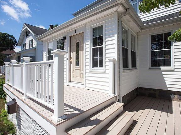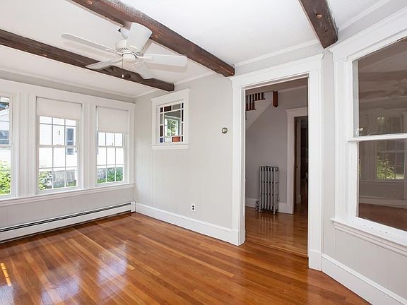 MOVE IN CONDITION, HIP ROOF COLONIAL is perched on a beautiful CORNER LOT with gorgeous stone walls and front porch overlooking the NEIGHBORHOOD. Step into the sunroom, that leads to gracious foyer with pretty staircase and stained glass window. Walk into beautiful kitchen with maple cabinets, newer appliances, opens to a dining room with built-in cabinet, followed by living room/great room with high ceiling. Tiled mudroom with window seat and half bathroom with pocket door that includes washer and dryer. Walk up to the second floor which offers three bedrooms, all with gleaming hardwoods. Full bathroom with tiled floor and Jacuzzi tub, newer vanity/lighting. Plus walk up attic. Lovely backyard with garden area and fire pit. One car detached garage with extra storage space, plus pull down stairs and two car driveway. WALK TO T STATION, shopping, restaurants and two minutes to highway. All hardwood flooring are gleaming, inside of house all freshly painted.