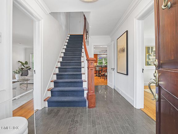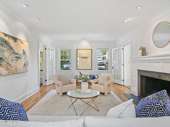 Minutes away from all Greenwich has to offer. Charming 5 bedroom home is within close distance to the train, park, shops and restaurants. The sun-filled, open layout features an entry that leads to a living room with a cozy fireplace, and a formal dining room perfect for entertaining. Kitchen with plenty of seating and office nook opens to a bright family room with access to a deck, ideal for outdoor dining. The spacious primary suite features two walk-in closets and a large bathroom. Two additional bedrooms, a full bath and a great office with built-ins round out the second level. The third floor offers two more bedrooms with a full bath and a second office with a private deck and winter water views. Refinished floors and new AC system. One-car detached garage.
